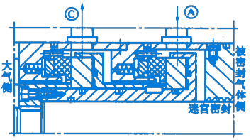 而被密封的氣體由A口引入,經密封端面外徑向內徑方向泄漏,泄漏的氣體經管口C排向火炬。大氣側的密封端面僅僅密封火炬和大氣之間很低的壓力差,所以由大氣側密封向內徑側泄漏的氣體是數量的。當被密封的氣體比較臟時候,一個迷宮密封應該裝在被密封介質側的前邊。高壓被密封的工藝氣體經過濾后,通過管口A引入密封內。