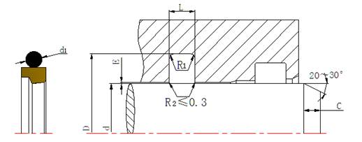 軸徑d h9 | 溝槽底徑D H9 | 槽寬L +0.2 | 0型圈線徑d1 | C≥ | R1≤ |