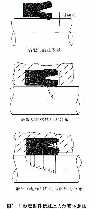 唇形密封件是指受壓呈唇形并具有壓力強(qiáng)化密封作用的一類密封件或襯墊。其結(jié)構(gòu)形式很多,除標(biāo)準(zhǔn)的V形、U形、Y形、L形和J形外,還有由這些形狀演變而來的各種特殊形狀。唇形密封件的密封原理是依靠密封件唇口與配合面之間的過盈量和工作介質(zhì)的壓力使唇形密封件產(chǎn)生彈性變形,以封堵相對運(yùn)動兩零件之間的間隙,達(dá)到密封的目的。圖1是U形往復(fù)運(yùn)動密封件( U形密封件是油壓缸中使用廣泛的油封,它是一種典型的唇口密封件,無論用于活塞或是活塞桿都能獲得良好的密封效果。主要應(yīng)用于重載行走機(jī)械或工業(yè)液壓中的活塞或活塞桿密封。)裝配和接觸壓力的分布示意圖,密封件裝入安裝槽時內(nèi)唇口與桿件相接觸發(fā)生變形,當(dāng)液壓油加壓后其整個滑動面與桿件的表面完全貼合在一起。