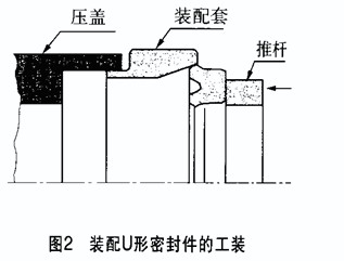 裝配唇形密封件時沒有使用專用工具,或長期懸掛在鐵絲上存放,均會造成唇形密封件損壞而漏油。圖2為U形密封件從唇部安裝時采用的工裝,它能地避免唇形密封件的唇頂被損傷。當(dāng)配合面的倒角不當(dāng)時,可在軸肩倒150~30°角,以避免唇形密封件損傷;如果因結(jié)構(gòu)限制不能倒角時,應(yīng)在裝配時使用專用套筒等工裝。顆粒性雜質(zhì)進(jìn)入系統(tǒng)后,附著在唇形密封件的配合面上,會造成唇形密封件受損。應(yīng)按時更換油,定期清潔和更換濾油器,以避免唇形密封件劃傷。