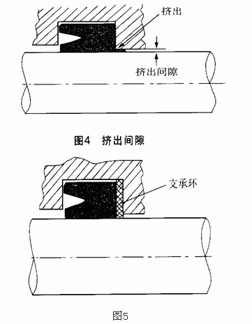 如果唇形密封件所受壓力與其背后的間隙不相適應(yīng),或支承環(huán)使用不當(dāng),會使唇形密封件的跟部進(jìn)入間隙而損壞,從而造成漏油(見圖4)。合理設(shè)置支承環(huán)可防止唇形密封件跟部被擠出(見圖5)。