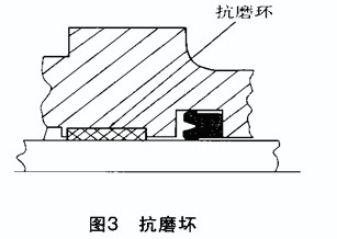 微動時低壓過高或行程過小,均會使油膜破裂、潤滑不足,造成表面鏡面磨損,應(yīng)改進(jìn)唇形密封件結(jié)構(gòu),增加抗磨環(huán)(見圖3);側(cè)壓過大,使抗磨環(huán)或活塞、軸承側(cè)向負(fù)茍過大,導(dǎo)致軸承磨損不均,若抗磨環(huán)不適合,也會造成滑動面不均勻磨損,應(yīng)當(dāng)更換抗磨環(huán);軸的偏心過大,使油封安裝孔與軸線不同心,活塞桿與缸頭、液壓缸缸筒和活塞的偏心值超出允許值,使唇形密封件不均勻磨損,從而造成漏油。此時,應(yīng)重新調(diào)整,使偏心量在允許的范圍內(nèi)。此外,配合面粗糙度大,會造成唇形密封件磨損量增大。實(shí)踐證明,軸表面粗糙度Ra=0.8~1.6μm、孔的表面粗糙度Ra=0.8~3.2μm時,就會使唇形密封件達(dá)到合理的壽命。