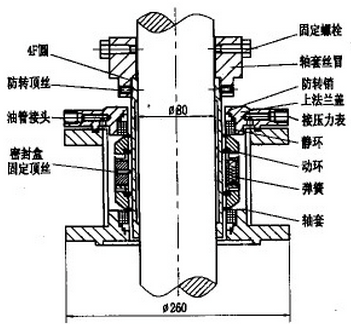 轉盤塔工藝條件:操作壓力0.6MPa,操作溫度150℃,主軸轉速0.5r/s,介質為10%的糠醛溶劑和減二、三、四線混合物料,安裝位置在塔頂部(高27m)。主軸直徑80mm,長15m,直徑與長度之比為1∶190,屬超細長軸,剛性差,偏擺性大??紤]到塔內物料含有10%的糠醛溶劑,糠醛溶劑遇空氣中的氧產生強氧化物,油變粘稠狀,而且具有腐蝕性。塔內物料不能漏出來,而空氣也不允許進入塔內。所以雙端面多彈簧、非平衡型密封形式作塔的軸封,如圖1