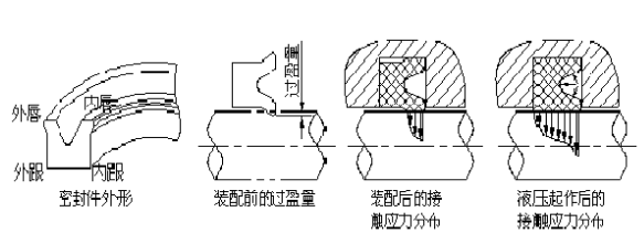 Y形密封圈的截面呈Y形,是一種典型的唇形密封圈。結(jié)構(gòu)簡(jiǎn)單、安裝簡(jiǎn)單,使用壓力較高(高可達(dá)40Mpa),密封性能良好,密封性能隨壓力升高而提高,并能自動(dòng)補(bǔ)償磨損量,摩擦力小,成本低,對(duì)油缸的表面要求也不高,是液壓缸使用廣泛的一種密封圈。按其截面的高、寬比例不同,可分為寬型、窄型、Yx型(兩唇不等高)等幾類,Y形密封圈依靠其張開的唇邊貼于密封副耦合面,并呈線狀接觸,在介質(zhì)壓力作用下產(chǎn)生“峰值”接觸應(yīng)力,壓力越高,應(yīng)力越大。當(dāng)耦合件以工作速度相對(duì)運(yùn)動(dòng)時(shí),在密封唇與滑移耦合面之間形成一層密封液膜,從而產(chǎn)生密封作用(如圖3)。密封唇邊磨損后,由于介質(zhì)壓力的作用而具有一定的自動(dòng)補(bǔ)償能力。寬型Y型圈一般適用于壓力小于20Mpa、工作溫度-30~100度、速度小于0.5米/秒的場(chǎng)合。窄型圈是寬型Y圈的改型產(chǎn)品,其截面長(zhǎng)寬比在2以上,不易翻邊,穩(wěn)定性好。Yx型是窄型Y圈中不等高唇型號(hào),有孔用和軸用之分,其短唇與密封面接觸,滑動(dòng)摩擦力小,耐磨性好,壽命長(zhǎng),長(zhǎng)唇與非運(yùn)動(dòng)表面有較大預(yù)壓縮量,摩擦阻力大,工作時(shí)不竄動(dòng)。安裝 Y形密封圈時(shí),唇口一定要對(duì)著壓力高的一側(cè),才能起密封作用。活塞用Y型Yx型)活塞上都要安裝導(dǎo)向環(huán),主要作用是 引導(dǎo)活塞做直線運(yùn)動(dòng),防止活塞因受力不均造成的走偏導(dǎo)致內(nèi)漏和減少密封件使用壽命等現(xiàn)象。
