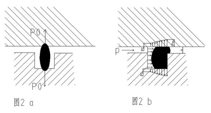 圖1為安裝在端蓋外圓與液壓缸內壁接觸位置的是端蓋靜密封圈;安裝在活塞與活塞桿之間的是活塞靜密封圈。液壓油缸都是液壓缸內的靜密封圈,端蓋靜密封是防止液壓油從端蓋和缸筒間的間隙漏出,單面承壓,要求防擠出能力強,密封效果好等;活塞靜密封是雙向承壓,防止液壓油從活塞和活塞桿之間漏出,要求防擠出能力強,密封效果好等。常見的靜密封圈為O型密封圈加擋圈,O形封圈是一種截面為圓形的橡膠圈,其材料主要為丁腈橡膠或氟橡膠,是液壓傳動系統中使用廣泛的一種密封件。它主要用于靜密封和往復運動密封,O形密封圈裝入密封槽后,其界面承受接觸壓縮應力而產生變形,當沒有介質壓力時,密封圈在自身的彈性力作用下,對接觸面產生一個預接觸應力p0,如圖2a)所示。而當容腔內充入有壓力的介質后,則在介質壓力p的作用下,O形密封圈發生位移,移向低壓側,且其彈性變形進一步加大,填充和封閉了密封間隙a此時,作用于密封副偶合面的接觸壓力上升為p0+p=pm,從而大大增加了密封效果,如圖2b)所示。
